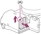 Pass på at tilgangslampen ikke lyser, og slå av kameraet. Skyv så låsehendelen (A) til side og ta ut batteriet. Vær forsiktig så du ikke mister batteriet.