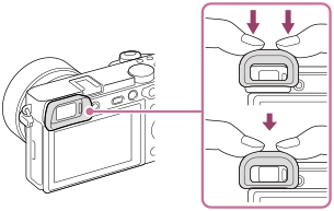 - Tilpass diopteret til synet ditt ved å bevege diopterjusteringsskiven til displayet vises tydelig i søkeren. Hvis det er vanskelig å dreie diopterjusteringsskiven, må du fjerne øyemuslingen og deretter justere skiven.