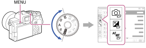 Οι ομάδες και τα στοιχεία του μενού που εμφανίζονται στις καρτέλες [Λήψη], [Έκθεση/Χρώμα] και [Εστίαση] διαφέρουν, ανάλογα με τη ρύθμιση του καντράν λειτουργίας.