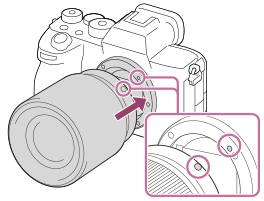 - Τοποθετήστε το φακό ευθυγραμμίζοντας τα δύο λευκά σημάδια (δείκτες τοποθέτησης) που υπάρχουν στο φακό και στη κάμερα.