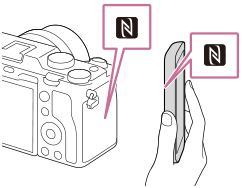 - Тази маркировка показва точката на докосване за свързване на фотоапарата със смартфон с включена NFC функция.