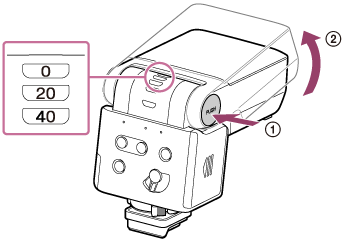 Когда наклон лампы вспышки составляет 0 градусов (0°), лампа вспышки фиксируется (механизмом фиксации поворота) для того, чтобы отключить регулировку угла отраженной вспышки. Для регулировки угла отраженной вспышки, когда лампа вспышки зафиксирована, нажмите и удерживайте кнопку разблокирования фиксатора поворота и наклоните вверх лампу вспышки.