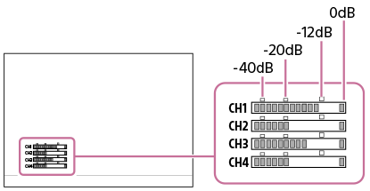 (Снимане) > [Audio Recording] > [Audio Level Display] > желана настройка.Когато е избрана настройката [On]: