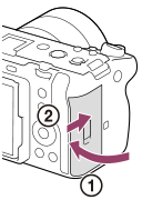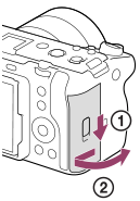 - Norėdami atidaryti dangtelį, pastumkite atminties kortelės dangtelio jungiklį.