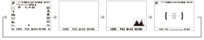 Prin apăsarea butonului DISP (Display Setting), puteți schimba conținutul afișat pe ecran în timpul fotografierii și redării. Afișajul se comută de fiecare dată când apăsați butonul DISP.