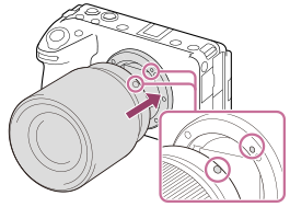 - Namestite objektiv, tako da poravnate beli oznaki (za namestitev) na objektivu in fotoaparatu.