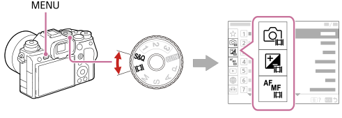 * Aangezien u zelfs in de stilstaand-beeldopnamefunctie bewegende beelden kunt opnemen met behulp van de MOVIE (bewegende beelden)-knop, worden ook enkele veelgebruikte menuonderdelen voor bewegende beelden afgebeeld.
