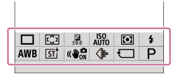 Hvis du trykker på Fn (funksjonsknappen) under opptak, vises en meny (funksjonsmeny) som inneholder ofte brukte funksjoner, for eksempel fokusområde og hvitbalanse, på skjermen, slik at du raskt kan hente opp funksjonene.