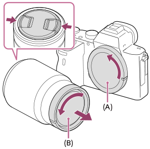 - 从相机上取下机身盖(A),从镜头后方取下镜头后盖(B)。