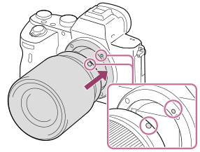 - 通过对齐镜头和相机上的两个白色指示标记(安装标记),安装镜头。