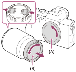 به فشار دادن دکمه آزاد سازی لنز (A) ادامه داده و لنز را در جهت فلش بچرخانید تا متوقف شود.