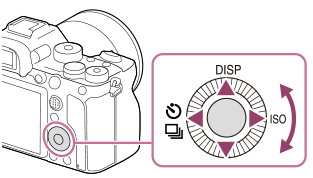 • Функции DISP (Установка дисплея), / (Режим протяжки) и ISO (ISO) назначены верхней/левой/правой стороне колесика управления. Кроме того, вы можете назначить выбранные функции левой/правой/нижней стороне и центру колесика управления, а также операции поворота колесика управления.