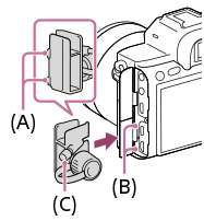 - Založte dva háčiky (A) na zadnej strane chrániča kábla do dvoch zárezov (B) naľavo od konektora USB typu C a Multi/Micro USB koncovky a potom zarovnajte chránič kábla s konektorovou časťou fotoaparátu.