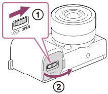 - Ανοίξτε το κάλυμμα της μπαταρίας/κάρτας μνήμης σύροντας το διακόπτη που βρίσκεται επάνω του.