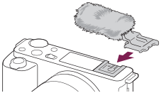 - Όταν συνδέετε το προστατευτικό ανέμου, προσέξτε να μην πιαστεί το προστατευτικό στην υποδοχή αξεσουάρ πολλαπλής διασύνδεσης Multi Interface Shoe.