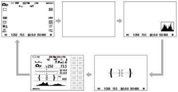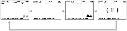 Με το πάτημα του κουμπιού DISP (Ρύθμιση οθόνης), μπορείτε να αλλάξετε το περιεχόμενο που εμφανίζεται στην οθόνη κατά τη λήψη και την αναπαραγωγή. Η εμφάνιση αλλάζει κάθε φορά που πατάτε το κουμπί DISP. Η εμφάνιση του εικονοσκόπιου και η εμφάνιση οθόνης για την λήψη μπορούν να ρυθμιστούν ξεχωριστά.