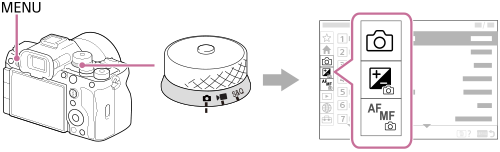 * Aangezien u zelfs in de stilstaand-beeldopnamefunctie bewegende beelden kunt opnemen met behulp van de MOVIE (bewegende beelden)-knop, worden ook enkele veelgebruikte menuonderdelen voor bewegende beelden afgebeeld.