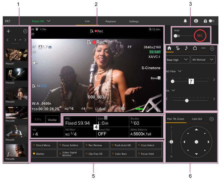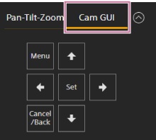 Χρησιμοποιήστε την οθόνη ελέγχου του γραφικού περιβάλλοντος χρήστη για χειρισμό του μενού της κάμερας, την αναπαραγωγή κλιπ και άλλες λειτουργίες. Πατήστε στην καρτέλα [Cam GUI] (Γραφικό περιβάλλον χρήστη κάμερας) για να εμφανίσετε το παράθυρο ελέγχου του γραφικού περιβάλλοντος χρήστη.