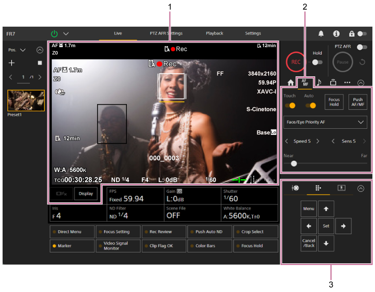 The focus is adjusted using the following parts of the live operation screen.