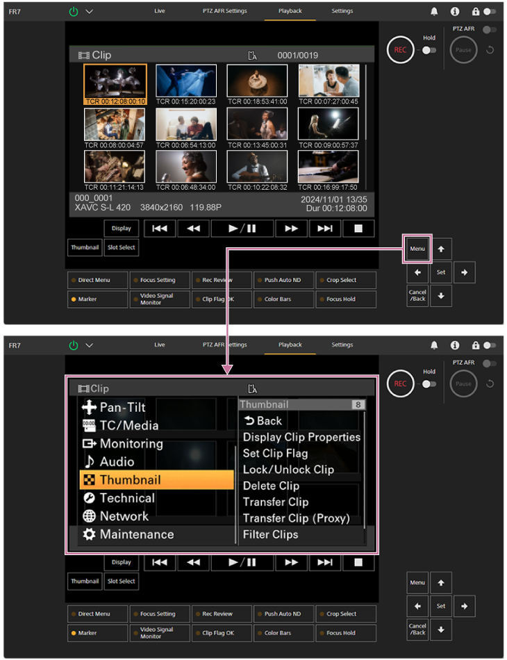 On the thumbnail screen, you can operate the clips or check clip properties using the [Thumbnail] menu in the camera menu.