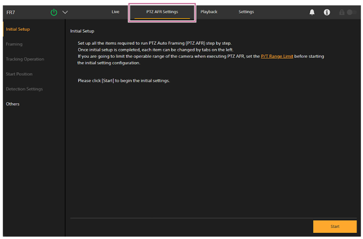 - Pour en savoir plus sur la configuration, consultez « Structure de l’écran des réglages PTZ AFR » et « Configuration des réglages initiaux du cadrage automatique PTZ ».
