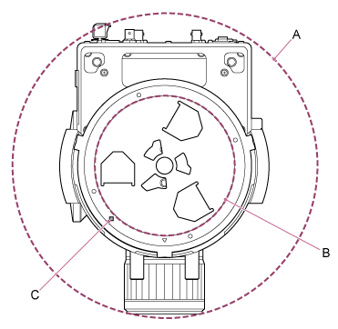 A: raspon pokreta glave fotoaparata (npr. SEL70200GM2 (s pričvršćenim SEL20TC): Ø340)