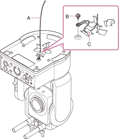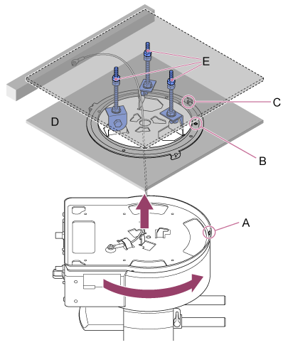 Poravnajte otvor vijka (A) na nosaču za tijelo s otvorom ? (B) na nosaču za strop, umetnite jedinicu i zakrenite je za 60 stupnjeva u smjeru kazaljki na stopu sve dok se otvor vijka (A) i otvor vijka (C) ne poravnaju.