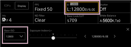 Pritisnite gumb [Base ISO/Exposure Index] na osnovnoj ploči konfiguracije fotoaparata i postavite [Base ISO] ploči prilagodbe osnovnog ISO-a / indeksa ekspozicije na [ISO 12800] ili [ISO 800].