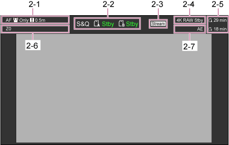 Ne. Zaslon Opis 2 – 1 Indikator načina fokusiranja Pogledajte „Indikator načina fokusiranja” u odjeljku „Prikaz zaslona fotoaparata”. 2 – 2 Način snimanja, utor A/B, indikator intervala snimanja Interval Rec Pogledajte odjeljak „Način snimanja, utor A/B, indikator intervala snimanja Interval Rec” u odjeljku „Prikaz zaslona fotoaparata”. 2 – 3 Indikator statusa usmjeravanja Prikazano tijekom usmjeravanja (samo kad je [Stream Setting] postavljen na [SRT-Caller]) 2 – 4 Indikator statusa rada RAW izlaza Prikaz statusa izlaza RAW signala. Pojedinosti o RAW formatu pogledajte u odjeljku „Snimanje RAW videozapisa”. 2 – 5 Indikator preostalog kapaciteta medija Pogledajte „Indikator preostalog kapaciteta medija” u odjeljku „Prikaz zaslona fotoaparata”. 2 – 6 Indikator položaja zuma Pogledajte „Indikator položaja zumiranja” u odjeljku „Prikaz zaslona fotoaparata”. 2 – 7 Indikator načina AE / razine AE Prikaz indikatora načina AE / razine AE. Pojedinosti o AE-u pogledajte „Prilagodba svjetline”. Gumb [Display]