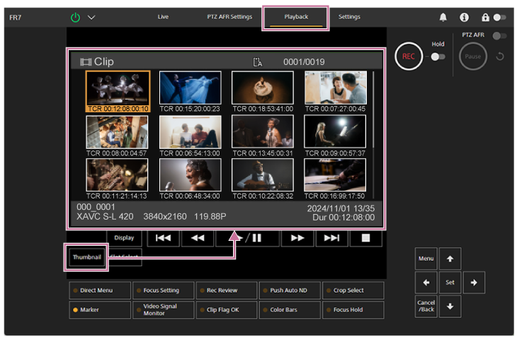 再生操作画面の[Thumbnail]ボタンまたは赤外線リモコンのTHUMBNAILボタンを押すと、メモリーカードに収録されているクリップが、カメラ映像部に表示されます。このカメラ映像部の表示をサムネイル画面と呼びます。