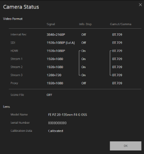 (fotoaparato būsenos) mygtukasPaspauskite šį mygtuką, kad atskirame ekrane būtų parodyta fotoaparatu įrašyto vaizdo / išvesties vaizdo signalo informacija ir objektyvo informacija.