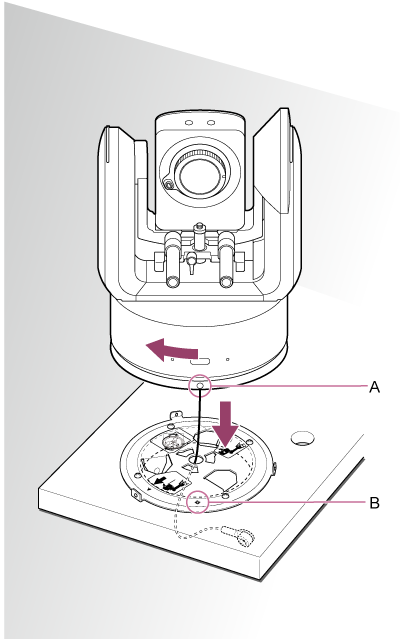 ? varžto skylę korpuso laikiklio priekyje sulygiuokite su ? skyle lubų laikiklyje, įstatykite įrenginį ir laikinai pritvirtinkite korpuso laikiklį prie lubų laikiklio pasukdami įrenginį pagal laikrodžio rodyklę.
