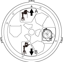Varžto skylę (A) korpuso laikiklyje sulygiuokite su ? skyle (B) lubų laikiklyje, įstatykite įrenginį ir pasukite jį maždaug 60 laipsnių pagal laikrodžio rodyklę, kol varžto skylės (A) ir (C) bus sulygiuotos.