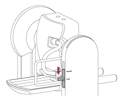 Sukite objektyvo atramos spaudžiamąsias svirteles prieš laikrodžio rodyklę ir atlaisvinkite objektyvo atramos bloką.