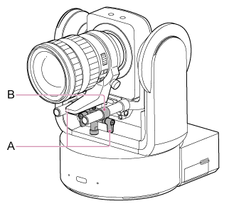 - Jei norite naudoti objektyvą su A tipo tvirtinimu, uždėkite objektyvo tvirtinimo adapterį (įsigyjamas atskirai) ant įrenginio, tada prijunkite objektyvą su A tipo tvirtinimu.