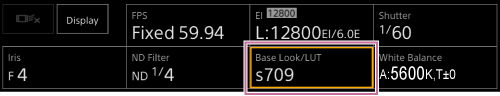 - Veikiant režimui [Cine EI], mygtukai [Base ISO/Exposure Index] (bazinis ISO / ekspozicijos indeksas) ir [Base Look/LUT] (bazinis vaizdas / LUT) rodomi pagrindinių fotoaparato funkcijų konfigūravimo skydelyje.