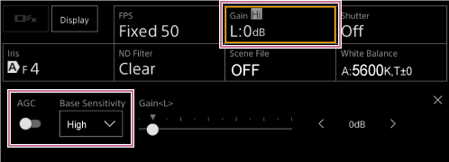 Pagrindinių fotoaparato funkcijų konfigūravimo skydelyje paspauskite mygtuką [ISO/Gain] (ISO / stiprinimas) ir nustatykite [Base Sensitivity] (bazinis jautrumas) ISO / stiprinimo reguliavimo skydelyje kaip [High] (didelis) arba [Low] (mažas).