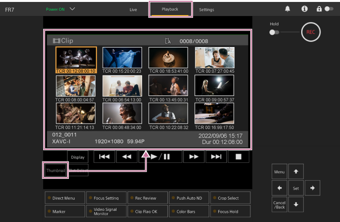 Jei paspaudžiamas mygtukas [Thumbnail] (miniatiūros) atkūrimo valdymo ekrane arba mygtukas THUMBNAIL infraraudonųjų spindulių nuotolinio valdymo pute, fotoaparato vaizdo skydelyje parodomi atminties kortelėje įrašyti klipai. Šis rodinys fotoaparato vaizdo skydelyje vadinamas miniatiūrų ekranu.