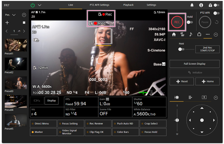 - Du kan også starte/stoppe opptaket ved hjelp av START/STOP-knappen for opptak på den medfølgende infrarød-fjernkontrollen.