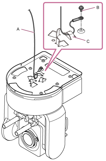- Atașați cablul cu sârmă furnizat pentru prevenirea căderii la suportul pentru tavan CIB-PCM1 (opțiune) pentru a preveni căderea unității.