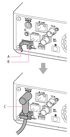 Fixați cablul adaptorului c.a. utilizând clema de cablu dacă doriți să preveniți deconectarea cablului.