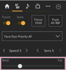 - În modul Face/Eye Only AF, focalizarea automată se focalizează pe fața cea mai apropiată de poziția de focalizare a glisorului [Focus].