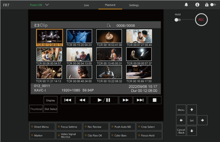- Când selectați un clip în ecranul miniatural și începeți redarea, poate exista o „rupere” scurtă a imaginii la începutul clipului. Pentru a vizualiza începutul clipului fără întrerupere, treceți unitatea în modul de redare, puneți în pauză, apăsați butonul