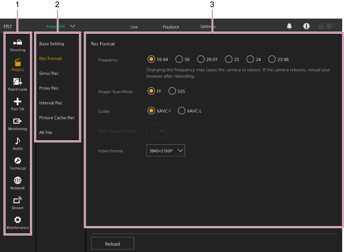 Apăsați fila de comutare a ecranului de operare [Settings] pentru afișarea ecranului cu setări, pentru a seta diferitele elemente de configurare a unității, inclusiv setările inițiale, setările rețelei, setările de captură/redare utilizând meniul web.
