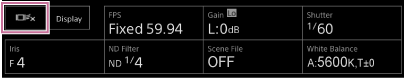 Nu. Display Descriere 2-1 Indicator pentru modul de focalizare Consultați „Indicator pentru modul de focalizare” din „Afișajul ecranului camerei.” 2-2 Mod de înregistrare, slot A/B, indicator interval de înregistrare Interval Rec Consultați „Mod de înregistrare, slot A/B, indicator interval de înregistrare Interval Rec” din „Afișajul ecranului camerei” 2-3 Indicator pentru starea de redare Este afișat în timpul redării în timp real (numai când opțiunea [Stream Setting] este setată la [SRT-Caller]) 2-4 Indicator de stare a operării ieșirii RAW Afişează starea de ieşire a semnalului RAW. Pentru detalii despre RAW, consultați „Înregistrarea clipurilor video RAW”. 2-5 Indicator capacitate rămasă pe suportul media Consultați „Indicator capacitate rămasă pe suportul media” din „Afișajul ecranului camerei.” 2-6 Indicator poziție zoom Consultați „Indicator poziție zoom” din „Afișajul ecranului camerei.” 2-7 Indicator pentru modul AE/nivelul AE Afișează indicatorul pentru modul AE/nivelul AE. Pentru detalii despre AE, consultați „Reglarea luminozității”. Butonul [Display]