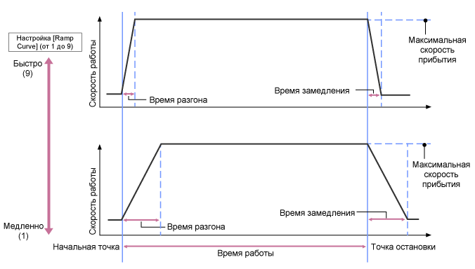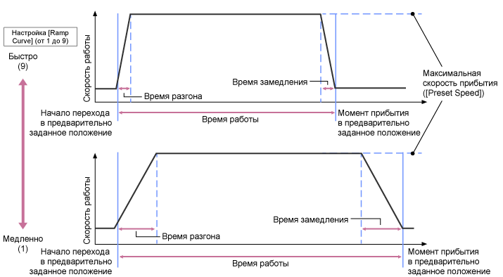 В пункте [Pan-Tilt] > [P/T Acceleration] > [Ramp Curve] веб-меню или меню камеры можно задать одно из девяти значений ускорения. Увеличьте это значение для более быстрого изменения скорости или уменьшите его для более плавного изменения скорости.