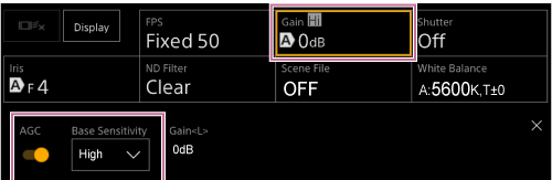 Нажмите кнопку [ISO/Gain] на панели основных настроек камеры и задайте для параметра [Base Sensitivity] на панели регулировки ISO/Gain значение [High] или [Low].