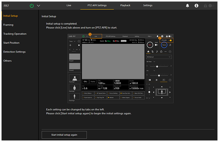 Отобразится экран [Initial Setup] экрана настройки PTZ AFR.