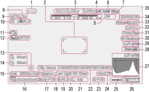 I Log-filmningslägena visar den Base ISO-känslighet inställd med knappen [ISO/Gain / Exposure Index] i kamerans grundläggande konfigurationspanel eller [Shooting] > [ISO/Gain/EI] > [Base ISO] i kameramenyn.