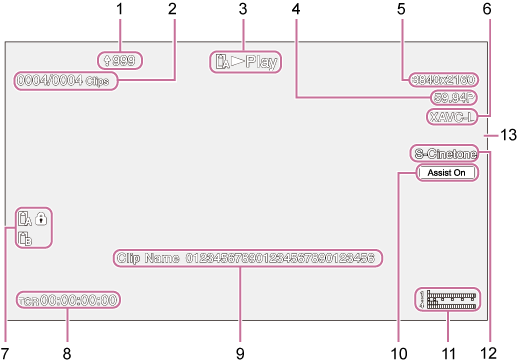 Om den blinkar stämmer inte det sista videoklippet på inspelningsmediet överens med inställningarna för [Camera ID] eller [Reel Number]. Du finner mer information i beskrivningen [Clip Name Format] > [Auto Naming].